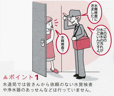 最近、水道局の職員になりすましたり、あたかも水道局が勧めているかのように言葉巧みな手口で突然家庭を訪問し、浄水器を売りつけたり、水道管や排水設備の点検・清掃を勧誘し、法外な請求を行う悪質な訪問販売が多発しています。ご注意ください。