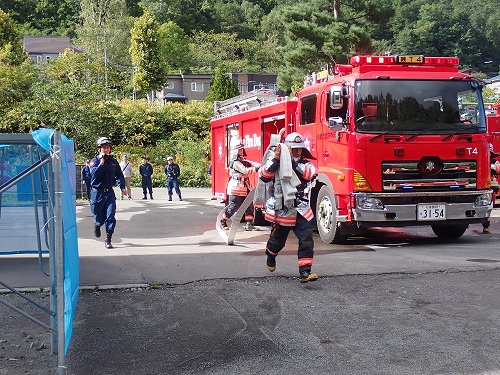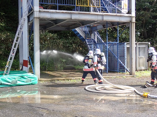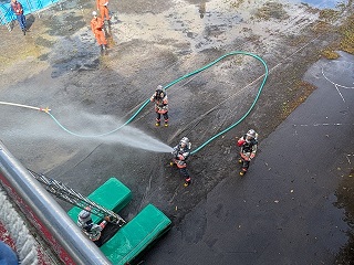 この訓練は、日頃の訓練成果を消防署長が確認するとともに、警防技術を向上させることを目的としており、二日間で消防隊12隊が訓練を実施しました。