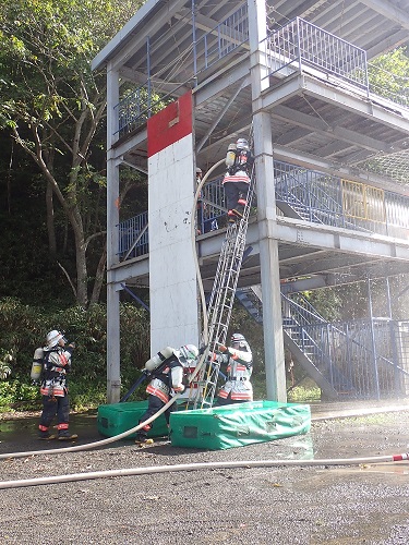 訓練内容は、「2階建て一般住宅1階から出火し、2階に延焼拡大中」という想定で訓練を実施し、訓練参加隊は日頃の訓練成果を発揮するために全力で活動していました。