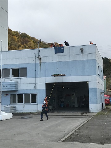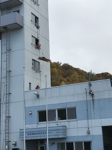 救助隊は、「8階建ての新築工事現場において、5階フロアで溶接作業中の作業員1名が崩れてきた足場により両足を負傷したもの」という想定で、作業員1名を地上に救出する訓練を実施しました。