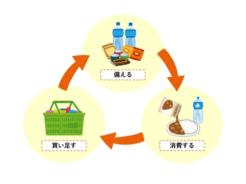 日常的に食品を少し多めに買い、古いものから消費し、使った分を買い足すことで、常に家庭に新しい食品が備蓄される方法。